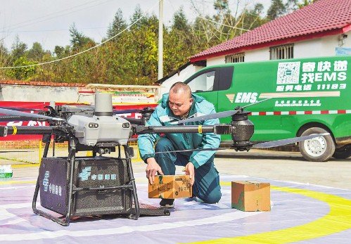 如果說深山高原的無人機(jī)運(yùn)郵是“雪中送炭”,那么城市周邊鄉(xiāng)村的無人機(jī)投遞則是“錦上添花”。在成都,邛崍和彭州兩市相繼開通常態(tài)化無人機(jī)郵路,使輕小郵件“朝發(fā)夕至”,目前累計(jì)投遞報(bào)刊6000余份、包裹400余件。在自貢市榮縣,無人機(jī)郵路開通后,涼水井村至高山鎮(zhèn)的郵件雙向流通時(shí)間節(jié)約了40分鐘,村民網(wǎng)購的商品和寄遞的土特產(chǎn)實(shí)現(xiàn)高效流轉(zhuǎn)。