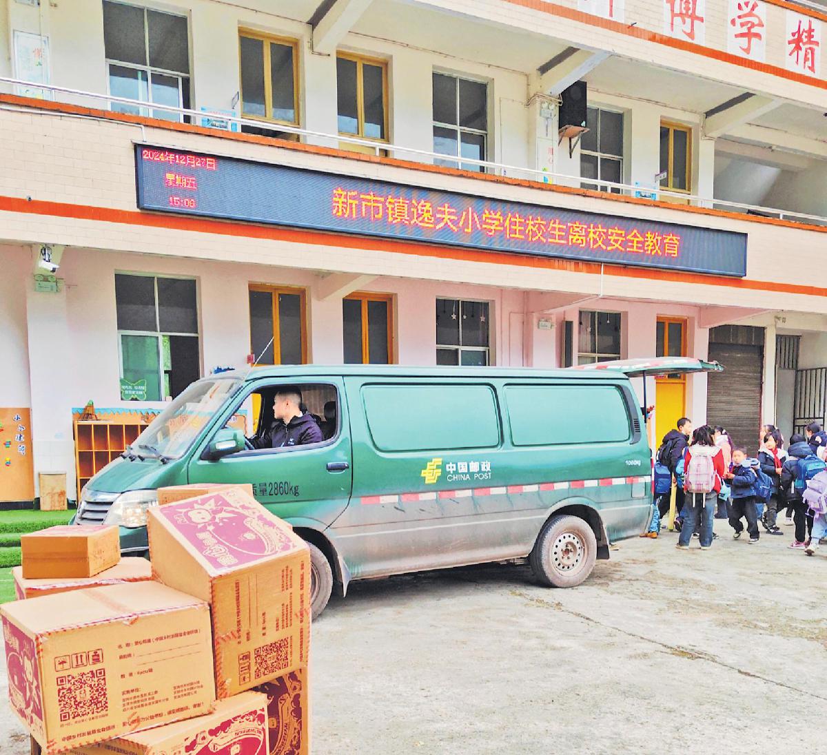 2024年末,郵車為宜賓市屏山縣新市鎮(zhèn)逸夫小學學生送去愛心包裹?!?/p>