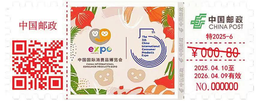 “第五屆中國國際消費品博覽會數(shù)字化彩色郵資機宣傳戳”采用目前最新款TS71郵資機制作,每一枚戳的規(guī)格為72mm×28.5mm,面值為0.8元,使用期限為2025年4月10日至2026年4月9日,全國共發(fā)行12.1萬枚。票面設計分為左中右三塊區(qū)域,左側印有“中國郵政”字樣;中間區(qū)域為主圖部分,展現(xiàn)的是消博會的吉祥物“元元”和“宵宵”擁抱的形象,吉祥物的原型是海南獨有、世界珍貴的靈長類動物長臂猿,同時巧妙地融合了海南熱帶雨林的自然風光以及消博會5周年的標識,既展現(xiàn)消博會的精品路線定位,又蘊含了海南特色風貌;右側的上方印有“中國郵政”字樣及標識,下方則是資費及使用期限;中間主圖及右側之間印有郵政特殊金屬防偽線。