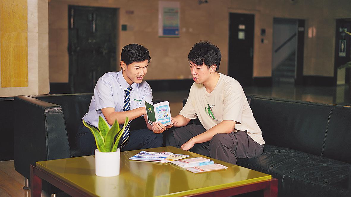 黃浦區(qū)支行營業(yè)部理財經理為客戶介紹理財產品。