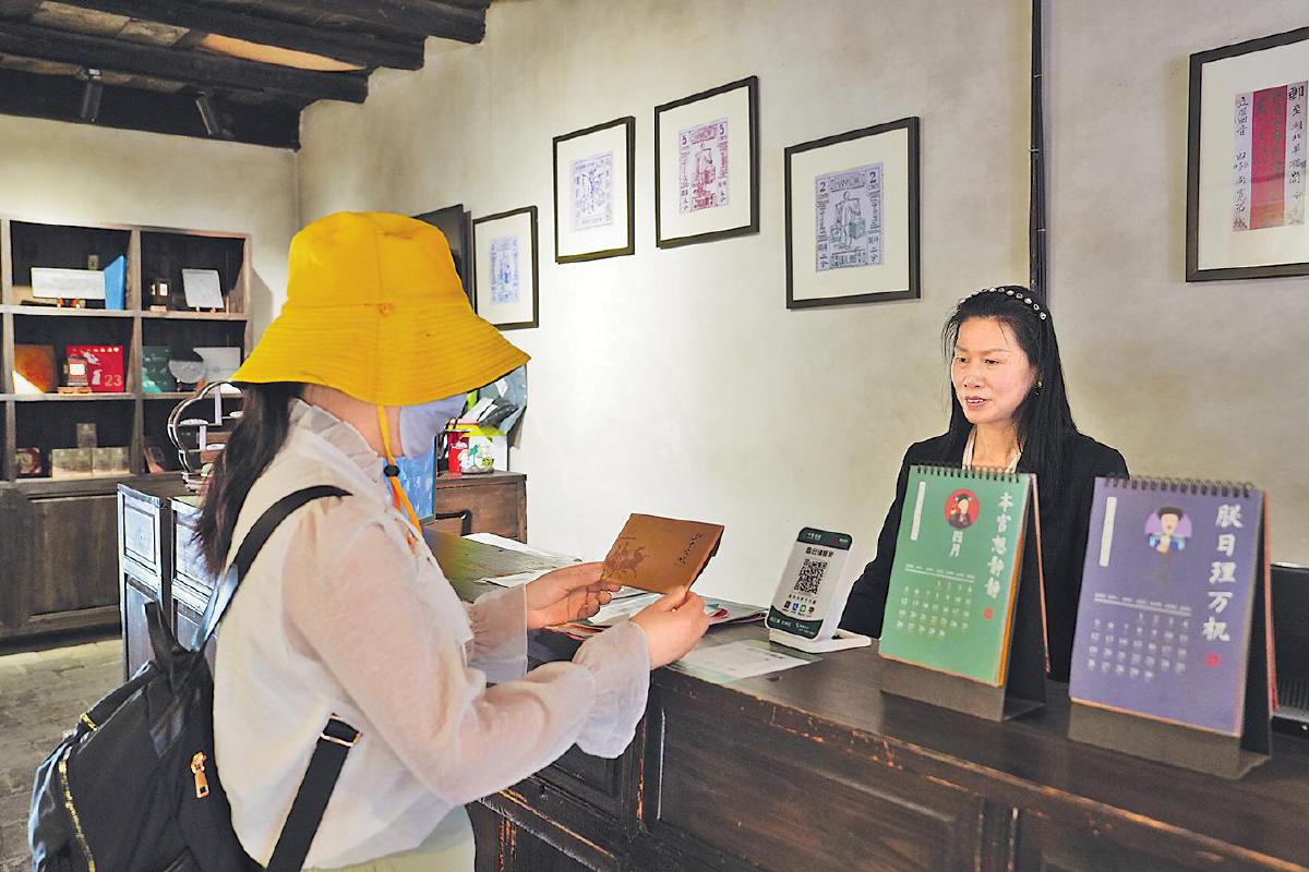 在郵政歷史陳列區(qū),一件件老物件呈現(xiàn)了中國(guó)郵政的發(fā)展脈絡(luò)。文創(chuàng)區(qū)木制展架上,“三國(guó)英雄”主題明信片、古鎮(zhèn)風(fēng)景冰箱貼等各類文創(chuàng)產(chǎn)品琳瑯滿目。為將郵政服務(wù)與茶文化深度融合,羊樓洞郵局開發(fā)了《萬(wàn)里尋茶道 赤壁借東風(fēng)》明信片,游客掃碼可觀看赤壁青磚茶文化和三國(guó)歷史故事;特制的郵票茶磚將《三國(guó)演義》系列郵票融入赤壁青磚茶制作工藝,透出濃濃的歷史韻味,吸引游客駐足觀賞、挑選購(gòu)買。