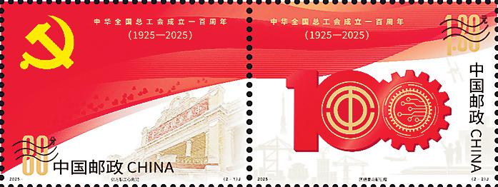 1925年5月1日,中華全國總工會在廣州正式成立。百年來,在黨的領(lǐng)導(dǎo)下,中華全國總工會櫛風(fēng)沐雨,始終與黨同心、跟黨奮斗,前赴后繼、奮勇拼搏,艱苦奮斗、建功立業(yè),譜寫了壯麗的篇章?!吨腥A全國總工會成立一百周年》紀(jì)念郵票圖案采用連票設(shè)計形式,以紅色為主色調(diào)。第一枚“億萬職工心向黨”,以黨徽、中華全國總工會廣州舊址為畫面主體,以意象化的紅旗為背景,并點綴心形圖案,象征中華全國總工會初心向黨,在黨的領(lǐng)導(dǎo)下走過百年光輝歷程。第二枚“團結(jié)奮斗新征程”,將中華全國總工會會徽、齒輪、芯片等與數(shù)字“100”組合設(shè)計,以意象化的紅旗為背景,并輔以城市建筑、港口、高鐵、飛機、火箭、空間站及勞動者等元素,象征著進(jìn)入新時代以來,中華全國總工會在黨的領(lǐng)導(dǎo)下不斷奮進(jìn),為實現(xiàn)中華民族偉大復(fù)興作出更大貢獻(xiàn)。