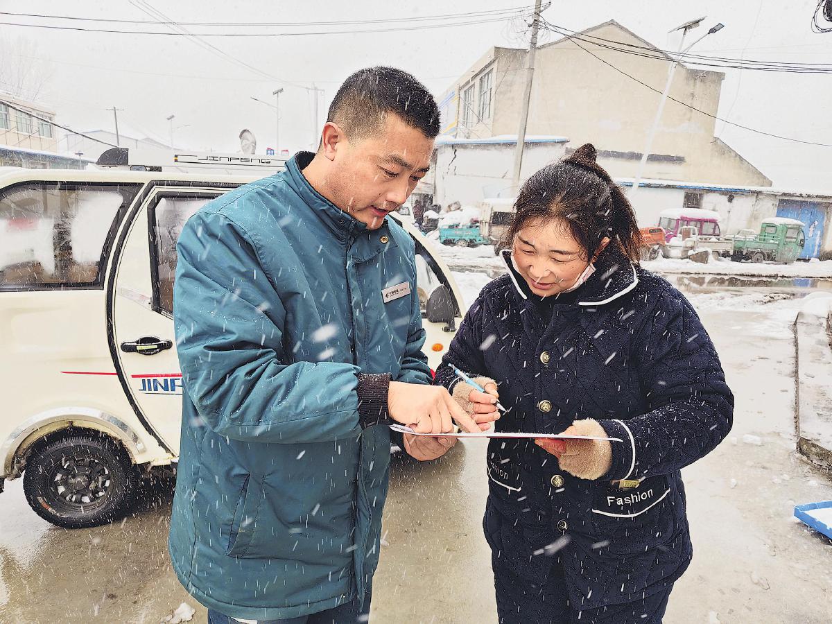 風(fēng)雪中,劉雷鋒為客戶(hù)投遞急需的證件。
