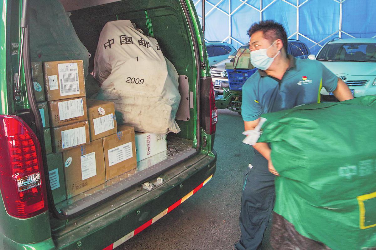 徐龍將郵件裝進(jìn)郵車。