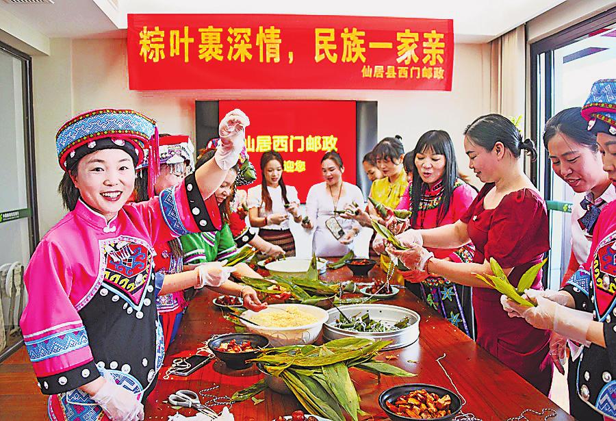 5月24日,浙江省仙居縣郵政分公司西門(mén)營(yíng)業(yè)所聯(lián)合仙居縣政協(xié)少數(shù)民族界別、工會(huì)界別,共同開(kāi)展“粽葉飄香迎端午 民族團(tuán)結(jié)一家親”主題活動(dòng)?;顒?dòng)現(xiàn)場(chǎng),來(lái)自苗族、侗族、畬族等10個(gè)民族的30余名同胞身著民族盛裝,與郵政員工、政協(xié)委員們共聚一堂,包粽子、迎端午、話(huà)家常。