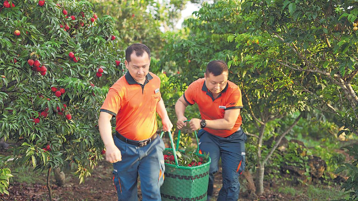 郵政員工在荔枝園里幫助果農(nóng)搬運荔枝。