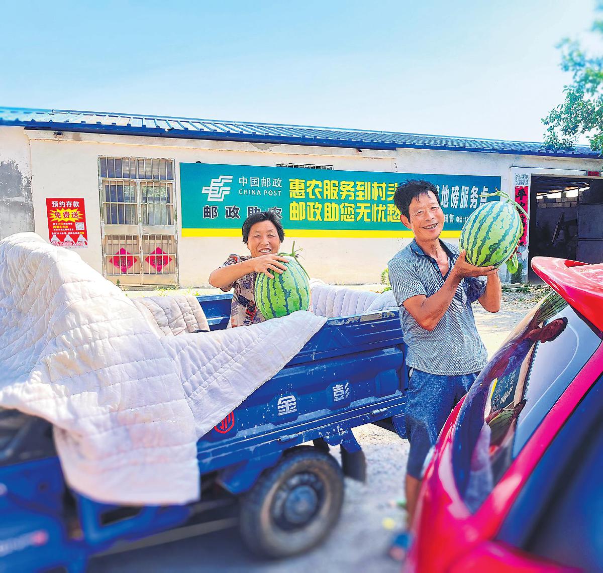 在濟(jì)寧市泗水縣郵政分公司設(shè)立的服務(wù)點(diǎn),西瓜種植戶準(zhǔn)備過(guò)磅裝車(chē)。□孫慧芹 攝