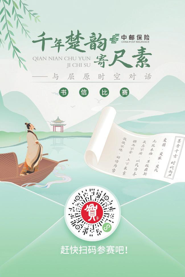 一紙方寸,千年楚魂。在《楚辭》特種郵票確定于5月31日首發(fā)后,湖北省郵政分公司提出以書信比賽為郵票發(fā)行引流造勢、同步推動函件業(yè)務發(fā)展的設想。5月11日,由中郵保險冠名的“千年楚韻寄尺素——與屈原時空對話”書信比賽橫空出世。此次比賽最大的亮點是參賽作品通過“寄賀卡”小程序線上征集,這也是中國郵政首次利用線上小程序開展的書信比賽活動。