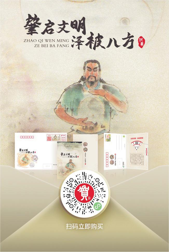 其中,《肇啟文明 澤被八方》明信片的設(shè)計(jì)十分新穎,畫面以水墨為底,暈染出伏羲的神韻,仿佛能看到遠(yuǎn)古智者的沉思;一幅可轉(zhuǎn)動(dòng)的八卦圖嵌入其中,輕輕撥動(dòng),“乾、坤、震、巽……”這些蘊(yùn)含宇宙相生規(guī)律的符號緩緩流轉(zhuǎn),如同將“萬事順意、生生不息”的祈愿,通過指尖的觸碰傳遞到心底;配套的定制信封,印刻“羲皇賜?!ぐ素猿屑弊謽?,羲皇形象與傳統(tǒng)八卦、祥瑞圖案相互交融。