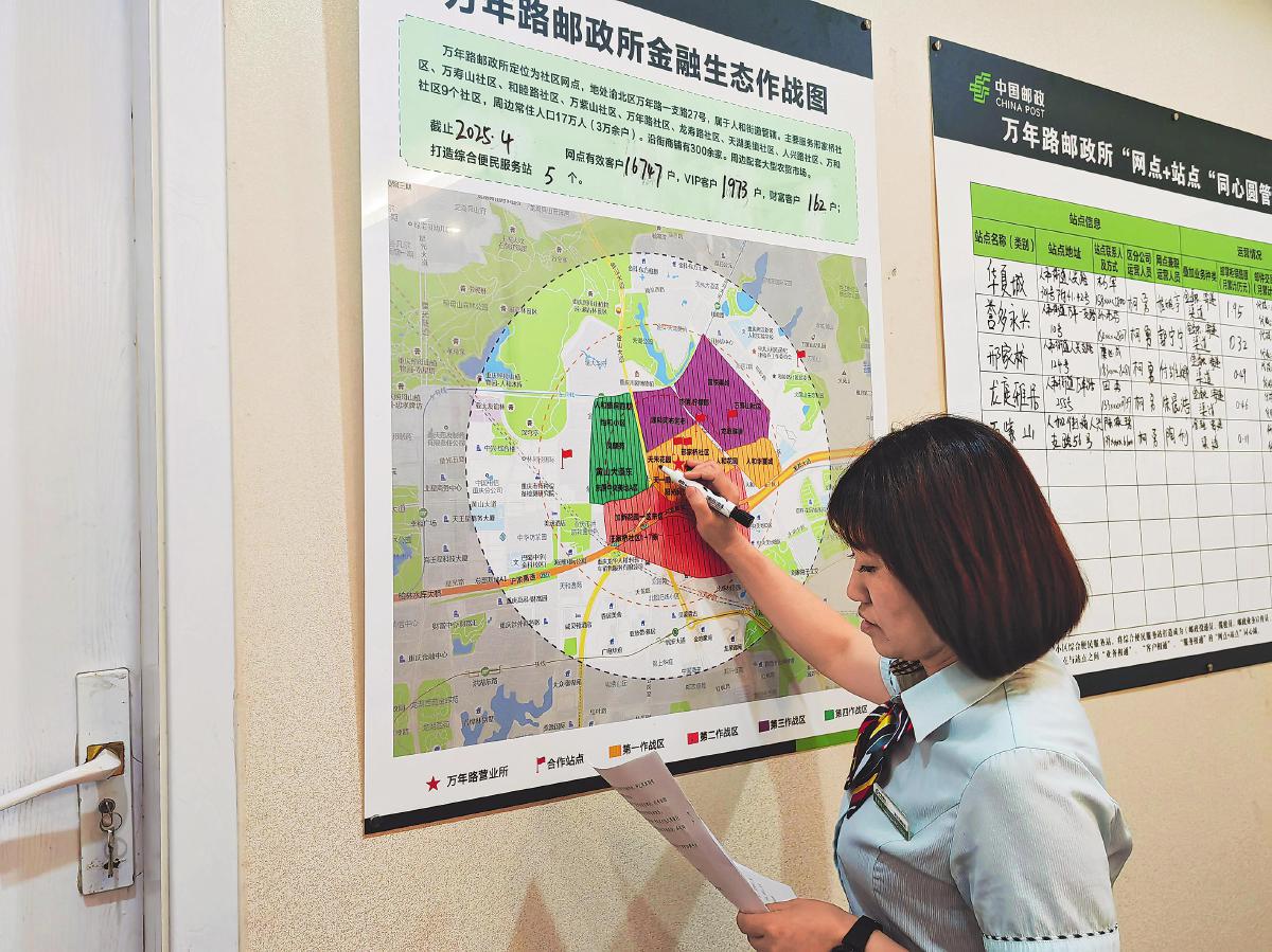 渝北區(qū)萬(wàn)年路郵政所負(fù)責(zé)人在“同心圓”管理看板上更新業(yè)績(jī)。