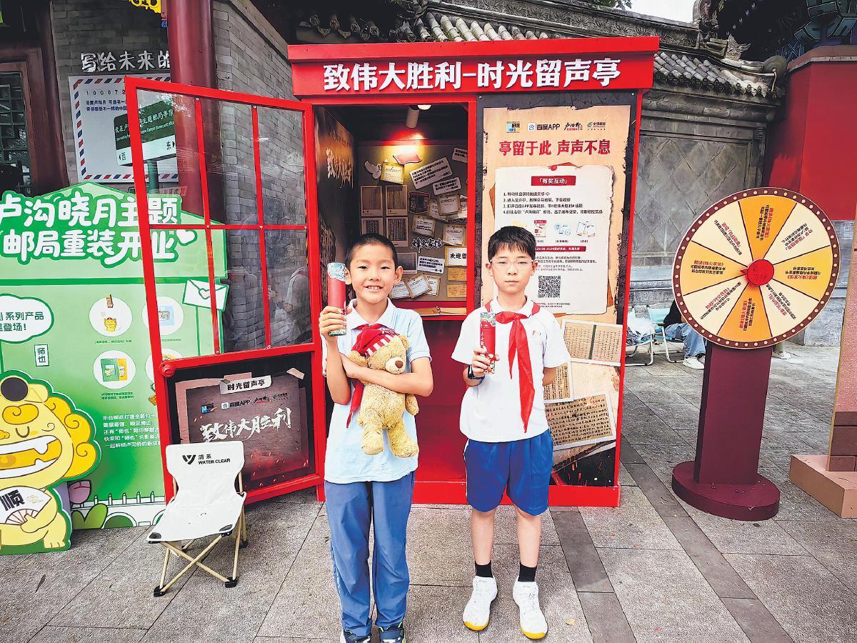 8月15日,“致敬偉大勝利”及烽火家信系列活動在北京市豐臺區(qū)宛平城啟動。該活動由百度App聯(lián)合新華網(wǎng)、軍事博物館、退役軍人事務(wù)部、北京市郵政分公司、盧溝橋文化公園等單位共同舉辦。游客在“致偉大勝利”時光留聲亭旁,轉(zhuǎn)動轉(zhuǎn)盤即可選擇錄制內(nèi)容,包括參觀抗戰(zhàn)展陳的體會、朗讀一封感人的抗戰(zhàn)家書或唱一首經(jīng)典革命歌曲,產(chǎn)生的優(yōu)質(zhì)視頻素材將由權(quán)威媒體整理后發(fā)布。參加“時光留聲”錄制的游客還可到旁邊的盧溝曉月主題郵局領(lǐng)取抗戰(zhàn)家書主題明信片,加蓋專屬紀(jì)念戳或購買其他文創(chuàng)產(chǎn)品。