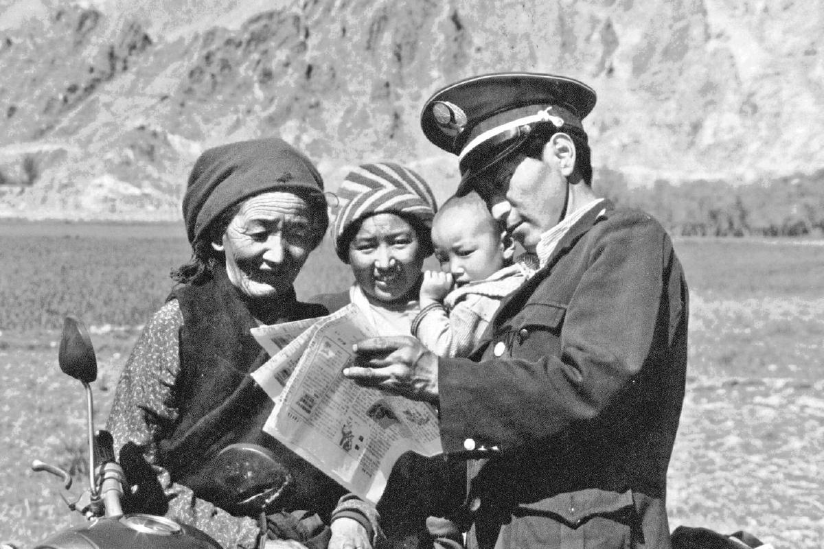 郵遞員為西藏農(nóng)牧民送報(bào)讀報(bào)。