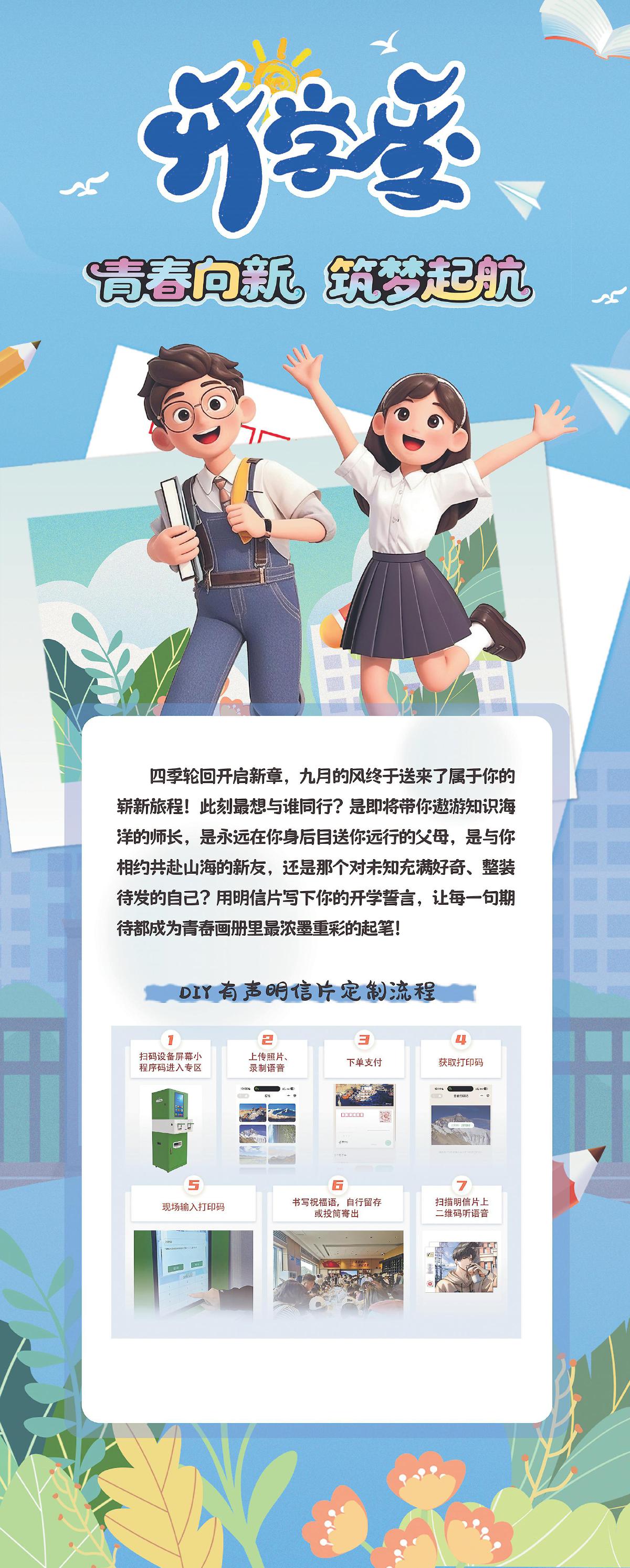 又是一年開學季,對中國郵政而言,校園市場始終是經營函件業(yè)務的核心陣地。今年9月1日至30日,江西省郵政分公司以“寄賀卡”小程序為紐帶,在全省開展“青春向新 逐夢啟航”開學季主題營銷活動——現(xiàn)場互動與校園產品營銷雙線并行,為莘莘學子的新學期增添一抹鮮活亮色,也為他們留存下一段難忘的青春記憶。