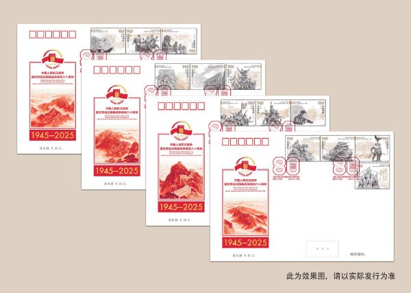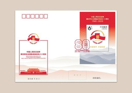 圖為《中國人民抗日戰(zhàn)爭暨世界反法西斯戰(zhàn)爭勝利八十周年》首日封和小型張首日封。(此為效果圖,請以實際發(fā)行為準(zhǔn))