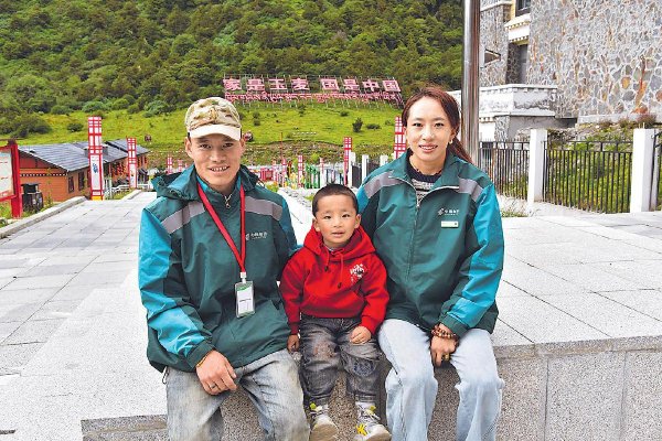 玉麥鄉(xiāng)郵政所投遞員旦增桑珠(左)、營業(yè)員索朗卓嘎(右)一家人的幸福合照。