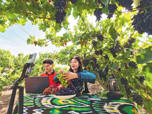 伊寧縣薩地克于孜鄉(xiāng)葡萄園內(nèi),郵政直播火熱進(jìn)行中。