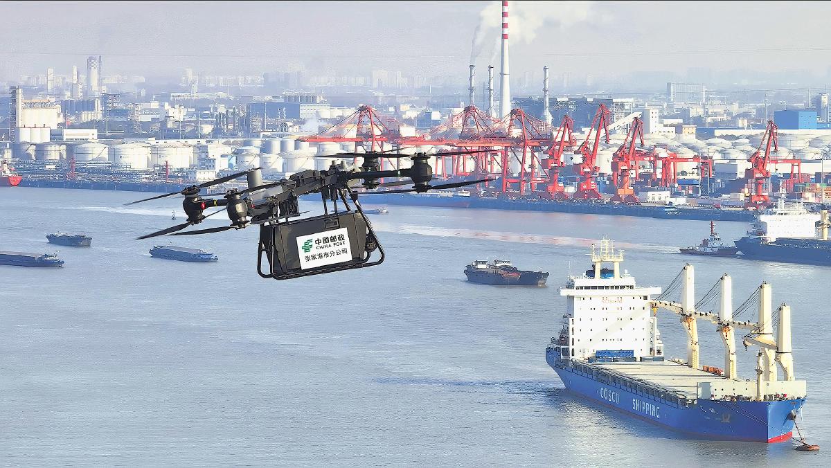 9月18日,江蘇省張家港市冶金園,一架載有30公斤快遞包裹的無人機飛往水上郵政快遞綜合服務站,標志著張家港首條跨長江無人機郵路正式運行。該郵路由張家港市郵政分公司聯(lián)合市海事局共同開通,通過“海事監(jiān)管+低空物流”融合模式,有效解決過往船員“購物難、取件難”的痛點。