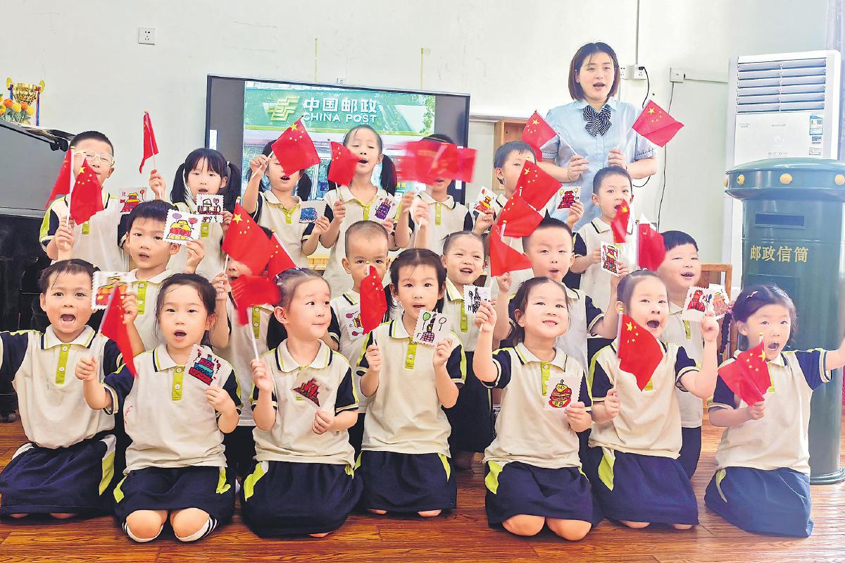“十一”國慶節(jié)即將到來之際,為將愛國主義的種子深植心田,讓民族自豪感蓬勃生長,江蘇省南通市海門區(qū)郵政分公司聯(lián)合該區(qū)通源幼兒園開展“郵趣慶華誕”主題活動(dòng),通過辨識(shí)郵政業(yè)務(wù)、學(xué)做郵帽、手繪郵票和明信片等形式,讓孩子們體驗(yàn)豐富多彩的郵政文化,共同迎接中華人民共和國成立76周年。圖為該幼兒園小朋友手舉國旗和手繪的郵票圖案,齊聲祝福偉大祖國生日快樂。