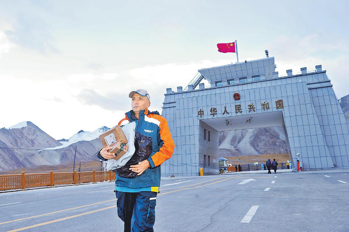 投遞員在紅其拉甫國(guó)門(mén)投遞郵件?!?/p>