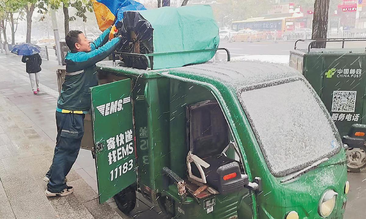 10月15日,黑龍江省哈爾濱市迎來今冬初雪,最低氣溫降至0攝氏度左右。風(fēng)裹著雪粒打在臉上,寒氣襲人。哈爾濱市郵政分公司迅速啟動應(yīng)急預(yù)案,加強(qiáng)作業(yè)調(diào)度,確保在雨雪天氣情況下郵件不積壓。一線攬投員克服道路濕滑等影響,主動延長投遞時(shí)間,及時(shí)為客戶送去包裹。這抹“冰城”初雪中的“郵政綠”生動踐行著使命必達(dá)的服務(wù)承諾。