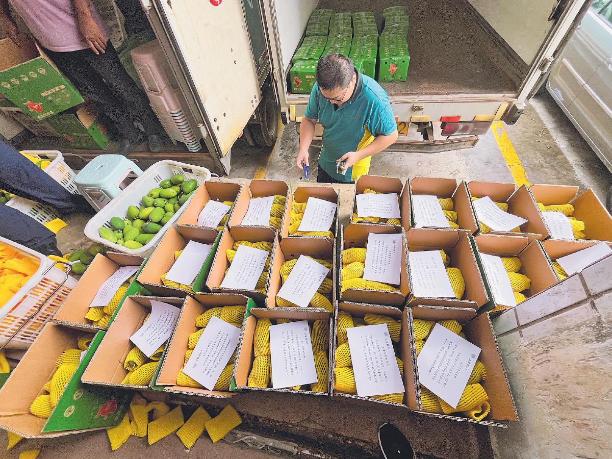 芒果剛采摘下來就被裝入郵車運走。