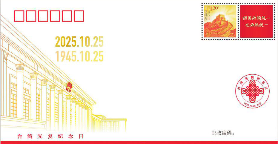 10月25日,《臺(tái)灣光復(fù)紀(jì)念日》紀(jì)念封發(fā)行。該紀(jì)念封由中共中央臺(tái)灣工作辦公室監(jiān)制,中國(guó)集郵有限公司發(fā)行,貼《長(zhǎng)城》個(gè)性化服務(wù)專用郵票,印紀(jì)念戳。
