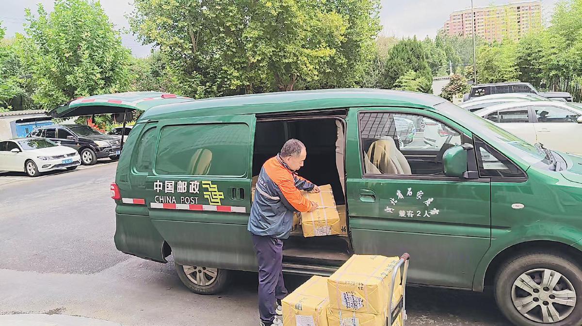 河北石家莊市分公司攬投員將重點政務(wù)圖書搬上郵車準(zhǔn)備配送。