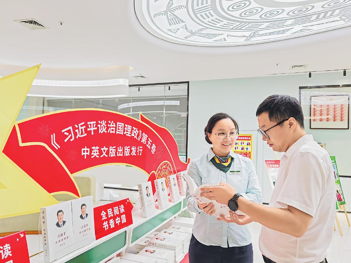 近日,走進(jìn)廣西壯族自治區(qū)南寧市金浦路郵政支局,一抹鮮艷的紅色映入眼簾,紅色背景的展板下,整齊排列著《習(xí)近平談治國理政》第五卷圖書。不少讀者在此駐足,有的神情專注地翻看,有的在聆聽工作人員介紹。市民張先生在選購圖書的人群里格外顯眼,他不僅自己購買,還打算幫家人和朋友代買。他表示,自己是一名黨員,《習(xí)近平談治國理政》第五卷圖書對提升黨性修養(yǎng)和理論素養(yǎng)大有裨益。“在郵政網(wǎng)點(diǎn)能夠買到正版重點(diǎn)圖書,十分方便,工作人員很貼心地向我介紹圖書的信息?!睆埾壬f。