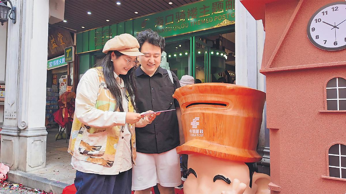 ??隍T樓老街是首批“中國(guó)歷史文化名街”。騎樓主題郵局位于老街中心位置,郵局一樓設(shè)有打卡蓋戳區(qū)、文創(chuàng)產(chǎn)品區(qū)、集郵品區(qū)、政務(wù)圖書(shū)區(qū)、海南特產(chǎn)區(qū)和郵??Х劝?,展架上擺滿(mǎn)了騎樓燈籠冰箱貼和騎樓主題郵局紀(jì)念封、主題郵冊(cè)等集郵文創(chuàng)產(chǎn)品;二樓陳列著郵政老照片、珍貴郵票,復(fù)原的老郵政辦公區(qū)成為熱門(mén)打卡點(diǎn)位。圖為一對(duì)來(lái)自甘肅的新婚夫婦在騎樓主題郵局郵寄紀(jì)念封,留下一份蜜月度假的美好記憶。