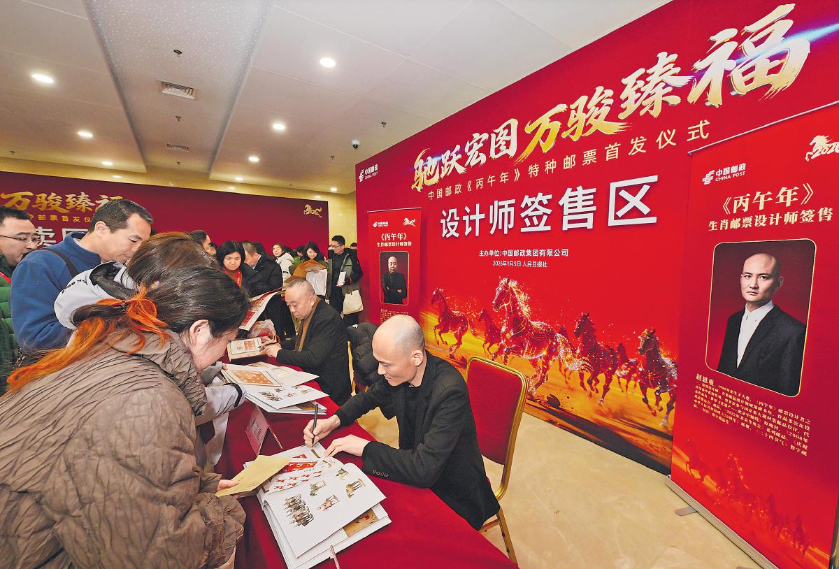 《丙午年》特種郵票設(shè)計者王紅衛(wèi)、趙恩重在首發(fā)儀式現(xiàn)場為郵迷簽售?!踔煺x 攝