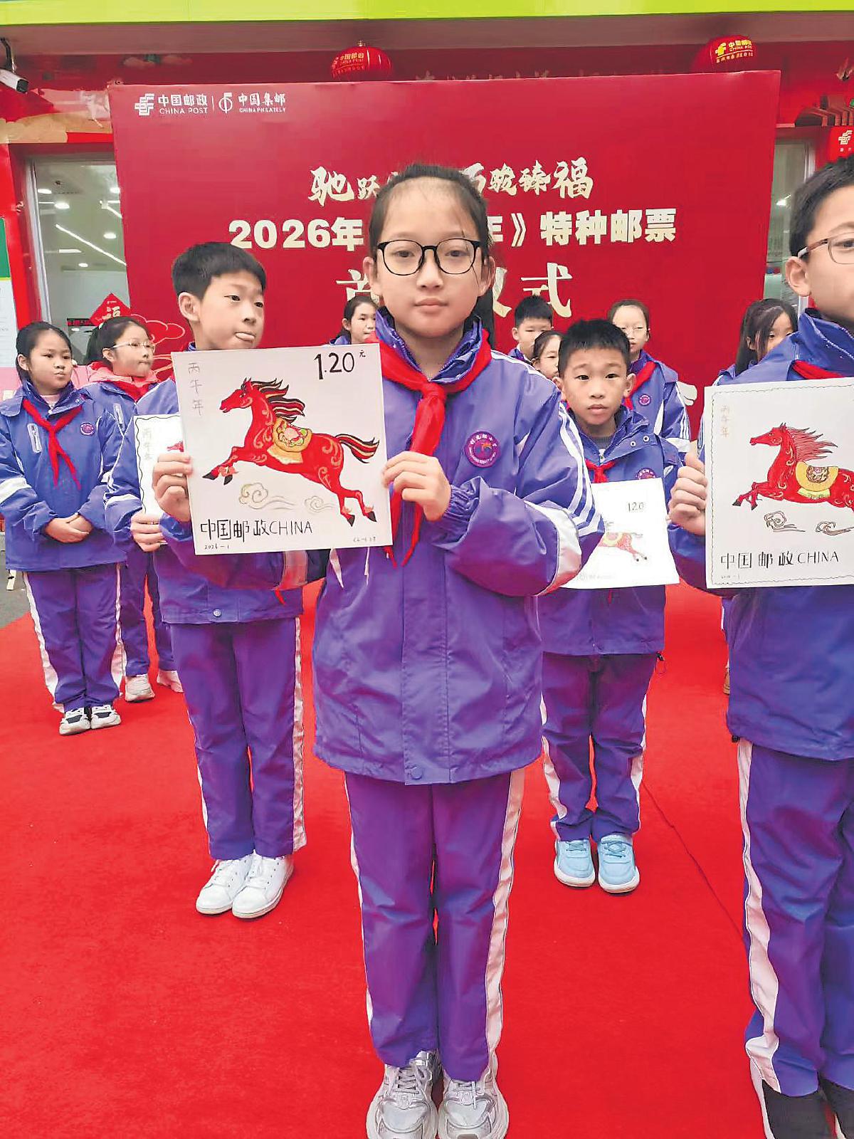 1月5日,《丙午年》特種郵票在全國發(fā)行。廣大民眾和集郵愛好者早早地來到郵政網(wǎng)點,爭相選購馬年生肖郵票,在生肖郵品上加蓋具有紀念意義的郵戳,定格這份獨特的收藏記憶。一位老郵迷忍不住分享道:“今年的生肖郵票設(shè)計得太有精氣神了。你看這駿馬的姿態(tài),透著一股往前沖的勁兒,寓意非常好!”