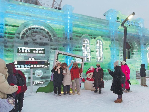 自第二十七屆哈爾濱冰雪大世界開園至今,冰雪郵局日均接待游客近5000人,元旦假期每天接待游客超萬(wàn)人。今年的冰雪郵局遷移至園區(qū)內(nèi)地標(biāo)性建筑——“雪花摩天輪”之下,采用“暖屋+冰燈包裹”的建筑設(shè)計(jì)。冰雪郵局推出的近300種涵蓋地方風(fēng)光與冰雪文化的封片及文創(chuàng)產(chǎn)品受到游客歡迎,門口的冰雕郵筒、雪娃娃和明信片留影框也吸引了眾多游客駐足打卡。