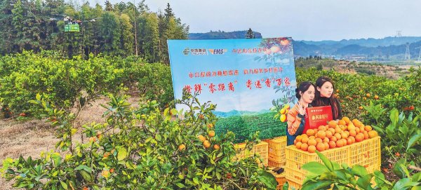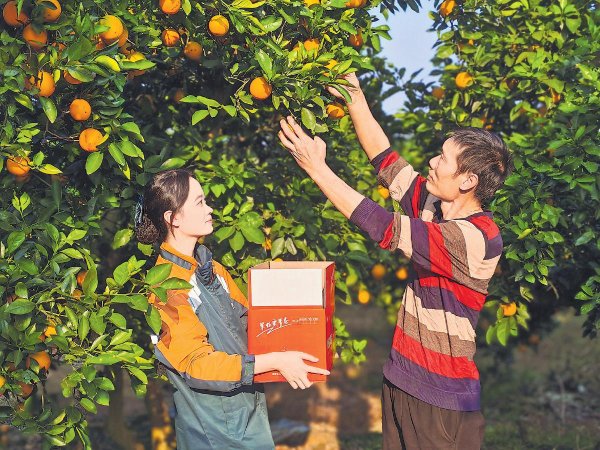 郵政員工化身“橙”意助手,與果農(nóng)并肩采摘,一箱箱冰糖橙瞬間變成“金果果”。