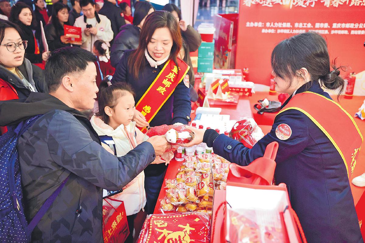 重慶西站“郵愛驛站”里,郵政工作人員向返鄉(xiāng)旅客遞上馬年玩偶并介紹相關(guān)惠民服務(wù)。