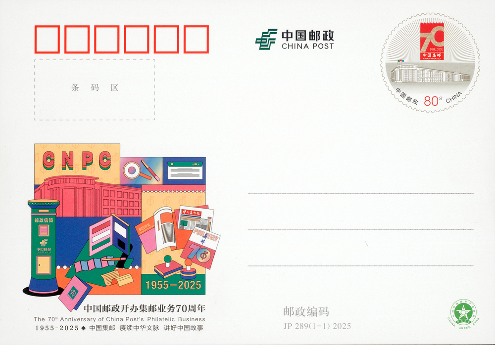 中國(guó)郵政定于2025年1月10日發(fā)行《中國(guó)郵政開(kāi)辦集郵業(yè)務(wù)70周年》紀(jì)念郵資明信片1套1枚。詳情如下: