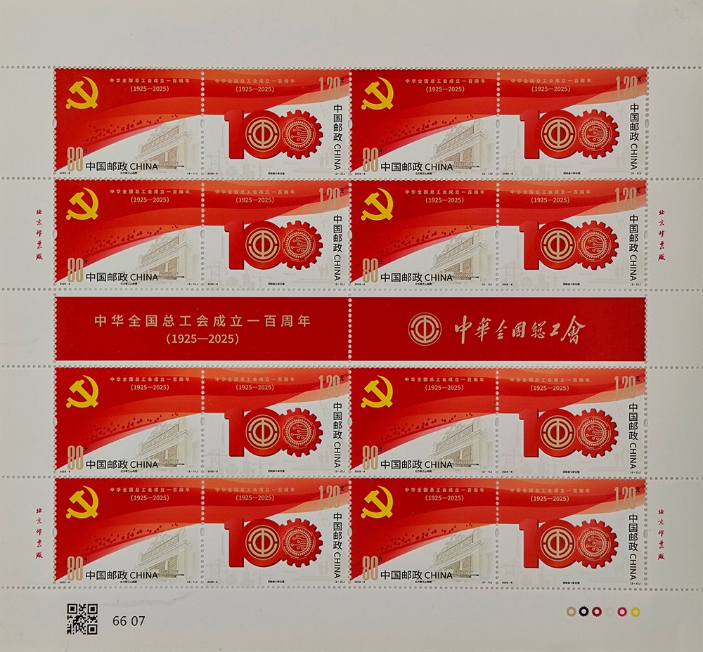 中國郵政定于2025年5月1日發(fā)行《中華全國總工會(huì)成立一百周年》紀(jì)念郵票1套2枚。詳情如下: