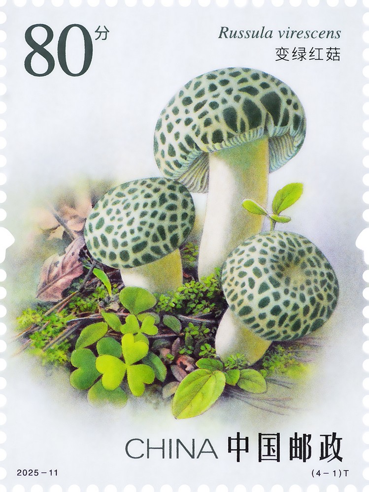 第一枚“變綠紅菇”,俗稱“青頭菌”,隸屬紅菇科。菌蓋較硬,呈青綠色,表面有青褐色的鱗片。其分布廣泛,鮮美的口感深受人們喜愛。郵票設(shè)計突出其青翠欲滴的色澤,并融入森林生態(tài)背景,使整體形象兼具自然野趣與美學(xué)韻味。
