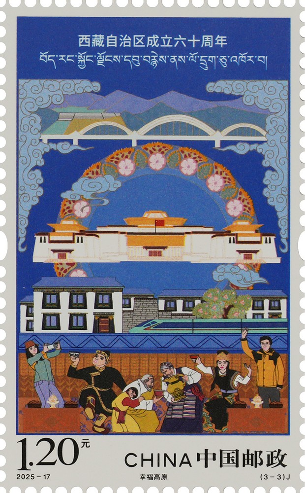 中國郵政定于2025年8月15日發(fā)行《西藏自治區(qū)成立六十周年》紀念郵票1套3枚,郵票圖案名稱為:同心筑夢、美麗雪域、幸福高原。全套郵票面值3.60元,計劃發(fā)行數(shù)量為490萬套。
