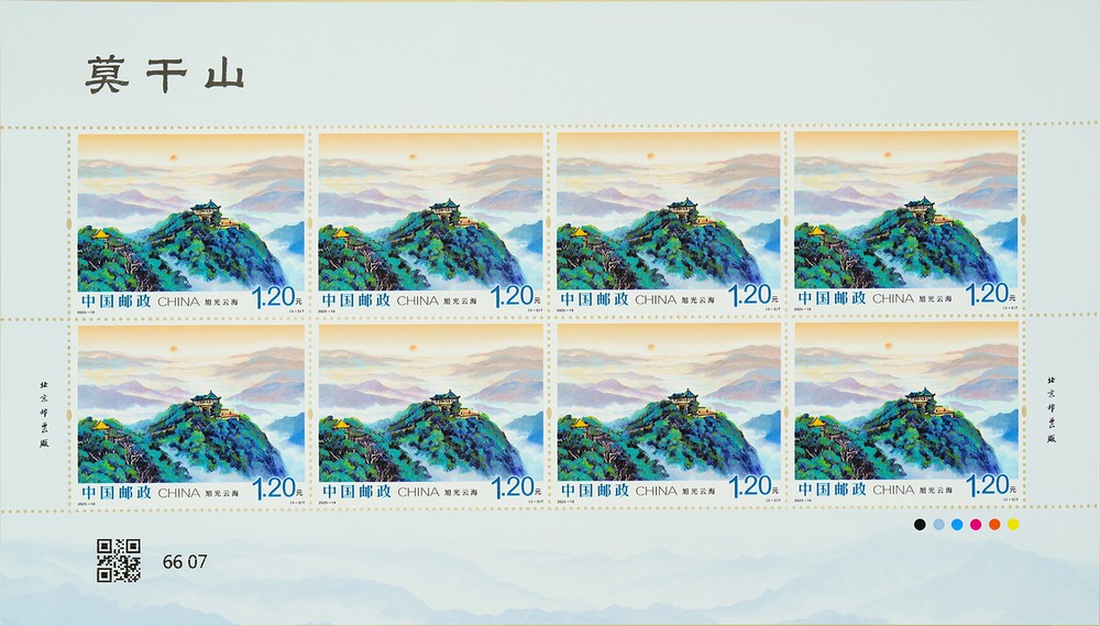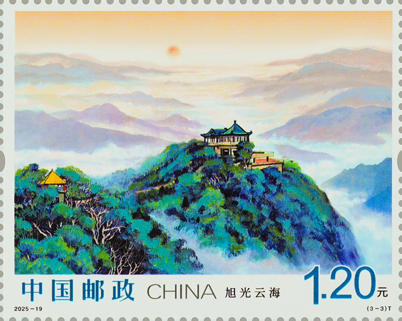 第三枚“旭光云?!?,描繪了莫干山的日出景象。該枚郵票定格了莫干山旭日東升的壯麗景象,旭光臺(tái)作為莫干山觀賞日出的絕佳觀景臺(tái),將天地交輝的盛景盡收眼底。遠(yuǎn)山如黛,云濤似海,萬道金芒為連綿山巒披上錦袍,昭示著此刻的莫干山正以更輝煌的姿態(tài)擁抱嶄新的未來。