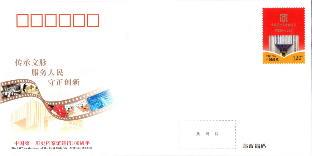 中國郵政定于2025年10月10日發(fā)行《中國第一歷史檔案館建館100周年》紀念郵資信封1套1枚。詳情如下: