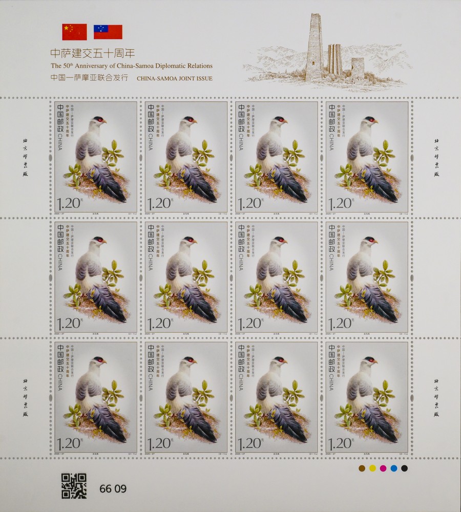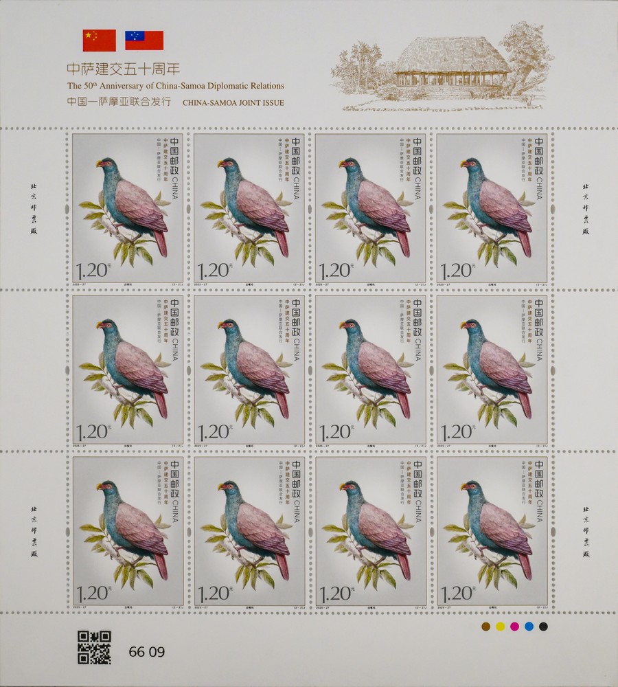 本套郵票以兩國(guó)的特色鳥類為核心設(shè)計(jì)元素,融西方鋼筆線條與東方淡彩的表現(xiàn)技法,筆觸細(xì)膩傳神,形象生動(dòng)逼真,兩只禽鳥顧盼相應(yīng)、神氣貫連,洋溢著蓬勃的生命力。本套郵票既展現(xiàn)兩國(guó)獨(dú)特的自然生態(tài)之美,更傳遞出兩國(guó)友誼的深厚底蘊(yùn)與美好未來(lái)。第一枚郵票表現(xiàn)了“白馬雞”。作為四川丹巴莫斯卡鳥類重要棲息地的主要保護(hù)物種,白馬雞也成為丹巴自然生態(tài)的鮮活代表,當(dāng)?shù)鬲?dú)特的高原氣候、適宜的生態(tài)環(huán)境為其提供了理想生存空間。第二枚郵票表現(xiàn)了“齒嘴鳩”。作為薩摩亞的本土特有鳥類,齒嘴鳩不僅是當(dāng)?shù)厣鷳B(tài)系統(tǒng)的重要成員,更被視為薩摩亞自然與文化遺產(chǎn)的象征,承載著薩摩亞人民對(duì)家鄉(xiāng)土地的熱愛與珍視。